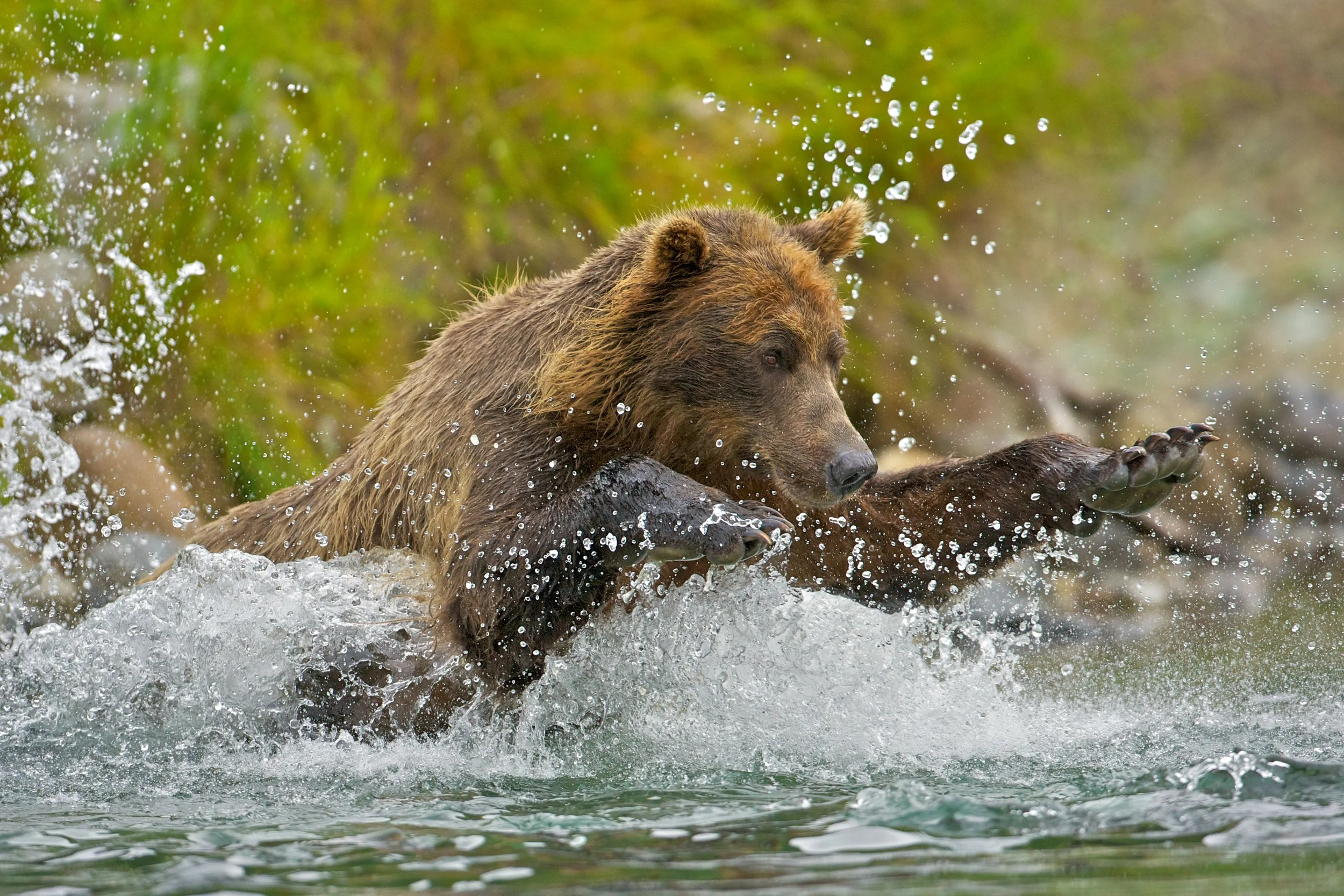 During our time in field you will get a chance to photograph bears fishing for salmon in many different ways. In one place along the river where it is a little bit deeper with clear water, some bears fish for salmon by diving under the surface. With the right equipment, there is a chance, with a little bit of luck, to get to photograph salmon fishing bears underneath the surface! At another location, bears can sneak from the river's edge on land and then jump free-flying straight into the river to catch salmon! Overall, there is very good opportunities for action pictures at Bear Creek, the bears run back and forth in the shallow river to catch salmon; the water splashes and the bears eagerly toss back and forth in the water after the salmon. In addition to bears, there is also sometimes wolves in the area and if you are really lucky you could get the possibility to photograph salmon fishing wolves.